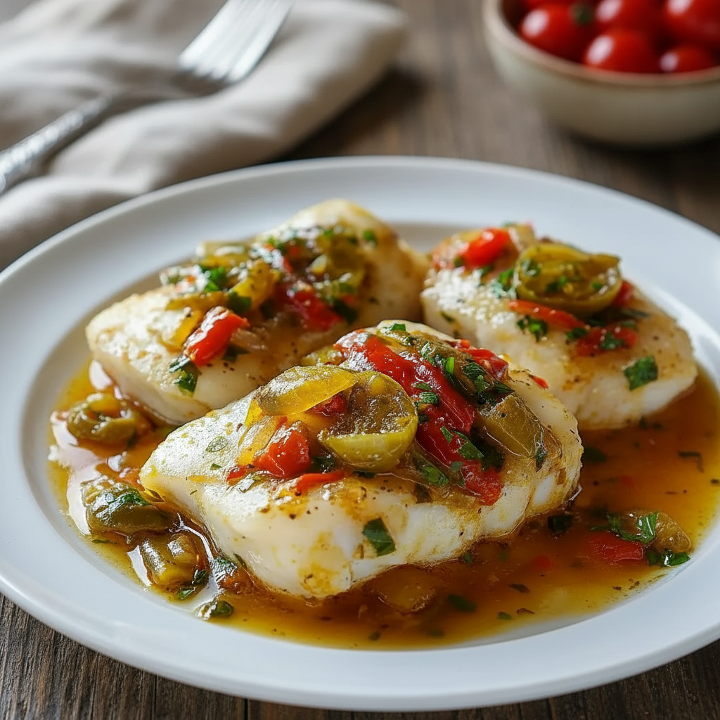 - Cocina el bacalao: Coloca los lomos de bacalao sobre el sofrito de pimientos y cebolla en la cazuela. Cocina a fuego muy bajo, cubierto, durante 8-10 minutos, o hasta que el bacalao se separe en lascas fácilmente al pincharlo con un tenedor.