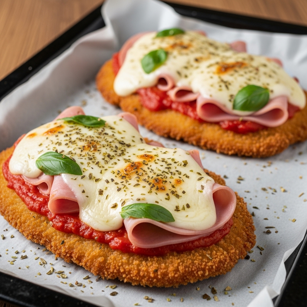 Cubre cada milanesa con una generosa capa de salsa de tomate. Coloca encima una rebanada de jamón cocido y luego una porción abundante de queso mozzarella. Espolvorea un poco de orégano seco sobre el queso.